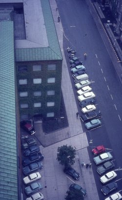In den späteren Dias aus dem Koffer „Architekturreisen“ führt Grundmann die Kamera sicherer und wagt auch ambitionierte Perspektiven. Für das ikonische Rathaus im dänischen Aarhus, gestaltet 1942 von Arne Jacobsen und Erik Møller, wählt er 1962 gleich zweifach die bauhauswürdige Draufsicht: einmal aus dem Fenster auf die davor parkenden Autos (Abb. 6), einmal über das Geländer auf die im Treppenauge stehenden Menschen (Abb. 7).[7] Auch in den folgenden Jahrzehnten begleitet er seine Touren akribisch mit der Kamera. Was ihm beruflich nützlich erscheint, was sich als Gedächtnisspeicher und Inspirationsquelle, als Illustration für Vorträge, Lehrveranstaltungen und Publikationen verwenden lässt, bewahrt er auf – sortiert nach Ort und Zeit. Seine Bildfolge ergibt keine private Urlaubserzählung von der Anreise über das Hotel bis zum Abflug. Er zerlegt das Gesehene vielmehr in einzelne Motive, die er je nach Anlass neu kombinieren kann. Schon in seinen frühen Berufsjahren erweist sich Friedhelm Grundmann damit als wohlinformierter Architekt und reflektierter Beobachter mit einer Vorliebe für Le Corbusier und den skandinavischen Stil. Statt die Inkunabeln und Ideale der Moderne zu überhöhen, nimmt er das alltägliche Zusammenspiel von (Städte-)Bau und Mensch in den Blick. Weitere Details seines Schaffens werden aktuell in einem Kooperationsprojekt[viii] von moderneREGIONAL und der Universität Hamburg – gemeinsam mit Greifswalder und Hamburger Studierenden – herausgearbeitet.