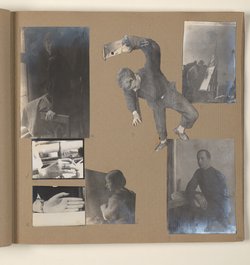 Kurt Schwitters wählt noch einen anderen Weg, um seine Fotografien und fotografischen Versuche zu ordnen und zu präsentieren. In vier umfunktionierten Zeichenheften montiert er zumeist Detailaufnahmen von Gesteinsformationen, Pflanzen, Stadt- und Landschaftsaufnahmen sowie Fotografien von industriellen Anlagen. Das hier vorgestellte Album ist mit „Beste Fotos“, die anderen drei mit „Mittlere Fotos“, „Schlechte Fotos“ und „Fotokompositionen“, überschrieben. Der Betitelung kann man Schwitters` Interesse entnehmen, seine Fotografien nach qualitativem Maßstab zu sortieren. Die weniger gelungenen Fotografien werden jedoch nicht wie bei Leo gar nicht erst ins Album aufgenommen, sondern in einem separaten Album untergebracht. Während bei Leo die Präsentation des Einzelbildes im Vordergrund steht, stellt Schwitters, bis auf wenige Ausnahmen, mindestens zwei und bis zu 14 Fotografien auf einer Doppelseite zusammen. Seine Anordnungen orientieren sich stärker als bei Leo an einer Rasterstruktur, die ebenso von den sehr ähnlichen Formaten der Fotografien herausgebildet wird. Auf der gezeigten Doppelseite sind die Fotografien motivisch gruppiert und thematisch gegenübergestellt – links Bodenstrukturen, Gesteinsformationen und Stadtansichten und rechts Bäume und Landschaftsaufnahmen. Fehlende Bildunterschriften verweisen darauf, dass Schwitters weniger an Botanik und Petrographie interessiert war, sondern vielmehr daran, Strukturen und Beschaffenheit von Objekten fotografisch festzuhalten. Da von Schwitters bis auf wenige Fotogramme keine fotografischen Arbeiten vorliegen, ist die konkrete Verbindung zu seinem Oeuvre bislang unklar und muss noch untersucht werden.