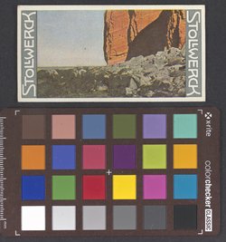 Noch vor den Brüdern Lumière gelang es dem Berliner Fotochemiker Adolf Miethe 1902–1904 ein kommerzielles farbfotografisches Verfahren zu lancieren, das in der Handhabung zwar mühseliger war als die damals gängige Fotografie, da drei Platten durch je verschiedene Farbfilter belichtet werden mussten (additives Verfahren),[10] aber letztlich war es doch praktikabel. Abgesehen von den hohen Preisen für das Negativmaterial und die längeren Belichtungszeiten, glichen sich Lumières und Miethes Verfahren darin, dass damit keine Abzüge hergestellt werden konnten. Die Aufnahmen nach Miethes Verfahren mussten entweder in einem kleinen Betrachtungsapparat (Chromoskop) eingelegt und durch Farbfolien übereinander projiziert werden oder über einen entsprechenden Projektor auf eine geeignete Oberfläche „geworfen“ werden. Da ihre Körnigkeit erheblich feiner war als bei Autochromen, ließen sie sich sehr gut vergrößern – bis auf 30 oder 40 Quadratmeter. [11] Zudem konnten die drei Negativplatten auch als Druckvorlagen für Farbauszüge verwendet und in einem aufwändigen Druckverfahren vervielfältigt werden (vgl. Abb. 1) während von Autochromen in einem gesonderten Schritt diese Auszüge erst erstellt werden mussten. Daher ergab sich – neben den höheren Kosten – für Berufsfotografen eine nur eingeschränkte Verwendbarkeit, was beide Verfahren wenig attraktiv machte. Die bei weitem größere Verbreitung des Autochrom-Verfahrens in Amateurkreisen sowie ein starker anglo-amerikanischer und französischer Fokus auf die Fotografiegeschichtsschreibung haben in der Rückschau dazu geführt, die Farbfotografie bis in die 1930er Jahre hinein beinahe synonym mit dem Lumière’schen Verfahren erscheinen zu lassen. Konkurrierende Verfahren, wie das Miethe’sche, welches die gedruckte Farbfotografie im deutschen Sprachraum von 1902/04 (Abb. 2) bis weit in die 1920er Jahre dominierte, werden dagegen fast ignoriert und der Themenkomplex „Farbe“ also auch hier nur eingeschränkt gewürdigt.