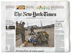 [4] The New York Times, 7. März 2022. Am Tag darauf erschien die internationale Ausgabe mit einer leicht variierten Titelseite, aber auch hier diente das Addario-Foto wieder als Aufmacher, wobei die Aufnahme wie bereits in der online-Ausgabe vom 6. März an den Rändern unbeschnitten zu sehen ist, so dass am linken Rand auch das Kriegerdenkmal deutlich ins Bild rückt.