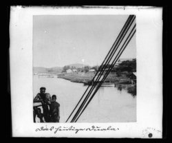 Die Ankunft vor der Küste Kameruns bei Duala inszenierte der Beginn des Vortrags in drei Bildern, von denen zwei aufzufinden sind.[14] Diese sind vom Schiff aus als erste Blicke auf die Kolonie von Überseereisenden beschrieben. Gut die Hälfte des Bildinhaltes wird vom Deck eingenommen, auf dem sich Kisten, Bündel und Konserven stapeln. Dazwischen sitzen und stehen Männer in Rückenansicht, die ihre Blicke auf die am Horizont sich abzeichnende Küste richten bzw. Masten und Segel des Schiffes inspizieren. Begleitend zum ersten Bild heißt es in gekürzter Fassung: „Nach vierundzwanzigtägiger Fahrt befinden wir uns im Kameruner Haff […]. Eine geraume Zeit lang erblicken wir an den fernen Ufern nur die eintönigen Mangrovenbüsche.“[15] Zum nächsten Bild folgt: „An Steuerbord verschwinden die Mangroven, das Gelände hebt sich, während wir am Backbord den gewaltigen Kamm des Götterberges betrachten können, denn es ist Spätnachmittag, die Zeit, wo der Bergriese ohne Nebelkappe erscheint.“[16] Mit dem dritten Bild-Text-Abschnitt war das Reiseziel erreicht: „Wir liegen im Fluß, neben dem Kanonenboot ‚Habicht‘ und dem Vermessungsschiff ‚Wolf‘, sowie der Hulk, die einst […] ein Kriegsschiff war.“[17] Personen lassen sich nicht identifizieren. Anstatt der erwähnten Mangrovenbüsche oder Schiffe ist auf den Fotografien im Hintergrund vage ein Küstenstreifen zu sehen.