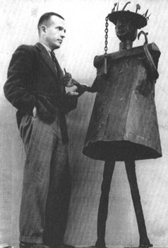 Michel Leiris gibt Gu, dem Gott des Krieges und des Eisens bei den Fon in Dahomey, die Hand, aufgenommen um 1947 im Musée de l'Homme, Paris