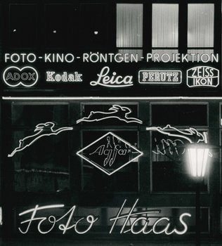 Neonröhren-Reklame an der Fassade der Firma Haas in Frankfurt am Main, 1952–1955 [Agfa-Werbearchiv, Museum Ludwig, Köln]
